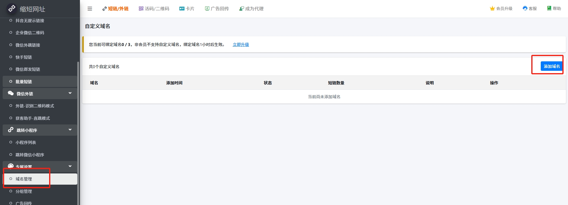 如下是阿里云注册备案域名流程,点击 注册完成后需求去备案域名,备案需要备案号,可以直接购买备案号(100元/个),或者购买最便宜的主机(99元/年)送5个备案号(推荐),根据备案流程完成备案 进入管理后台->专属设置-域名管理 输入你自有的域名(必须为阿里云备案域名),可以为二级子域名,这样可以不影响你原有的业务。例如你的域名为 mydomain.com,可以这里提交一个a.mydomain.com作为短链域名. 复制我们的CNAME,到阿里云配置 到阿里云域名列表,点击解析 设置CNAME记录 设置完成后,等待我们审核通过即可使用 如果需要设置SSL证书,请提供nginx证书给客服,等待我们技术配置, 查看如何获取SSL证书 如果你的域名不是阿里云注册备案的,请参照 阿里云备案帮助文档,或者联系阿里云客服备案