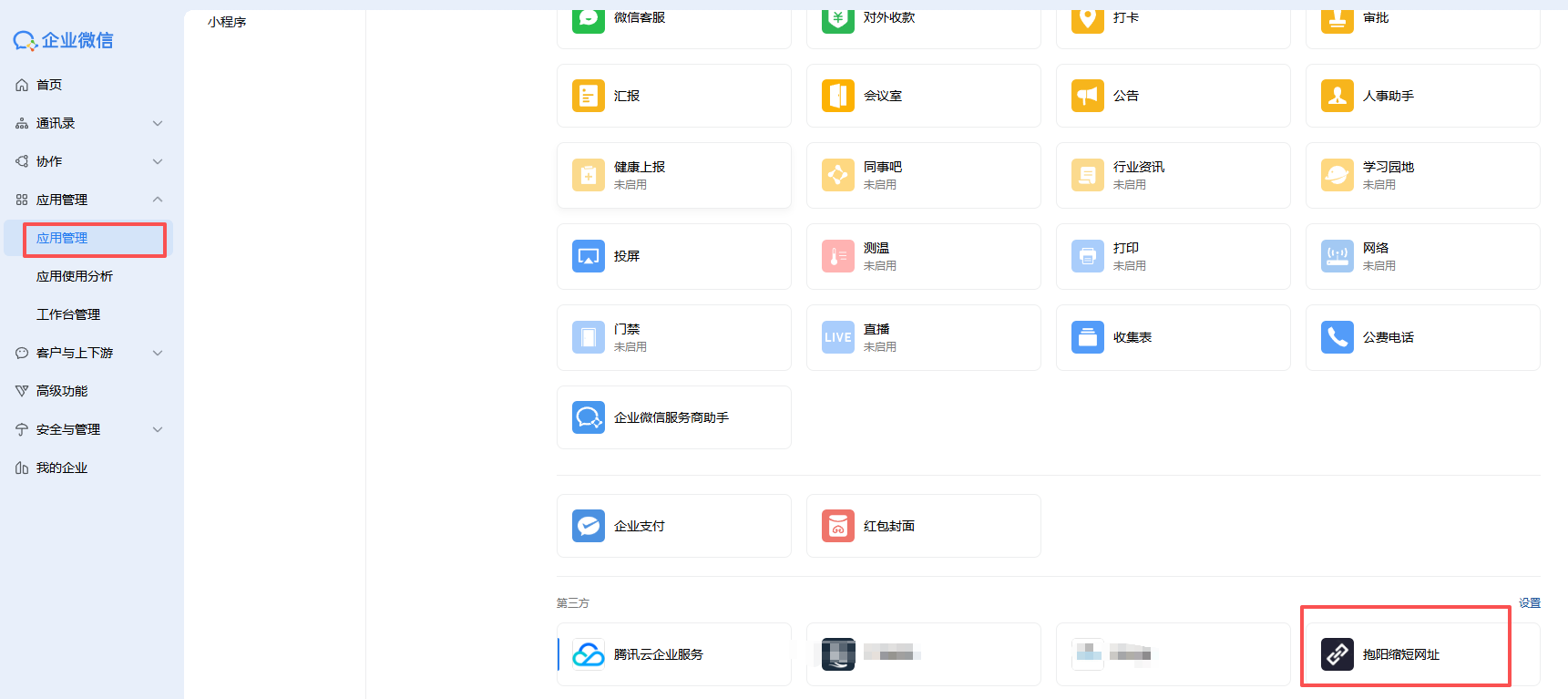 1. 管理员在电脑上打开企业微信,找到"应用管理",找到"第三方",点击"抱阳缩短网址"